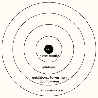 A:“Each of us is as it were entirely encompassed by many circles.... The first and closest circle is the one which a person has drawn as though around a centre, his own mind.... Next, the second one...contains parents, siblings, wife, and children. The third one has in it uncles and aunts, grandparents, nephews, nieces, and cousins.... that is followed by the circle of local residents...fellow-citizens...people from neighboring towns, and the circle of fellow-countrymen. The outermost and largest circle, which encompasses all the rest, is that of the whole human race. Once these have all been surveyed, it is the task of a well tempered man, in his proper treatment of each group, to draw the circles together somehow towards the centre, and to keep zealously transferring those from the enclosing circles into the enclosed ones.... The right point will be reached if, through our own initiative, we reduce the distance of the relationship with each person.”